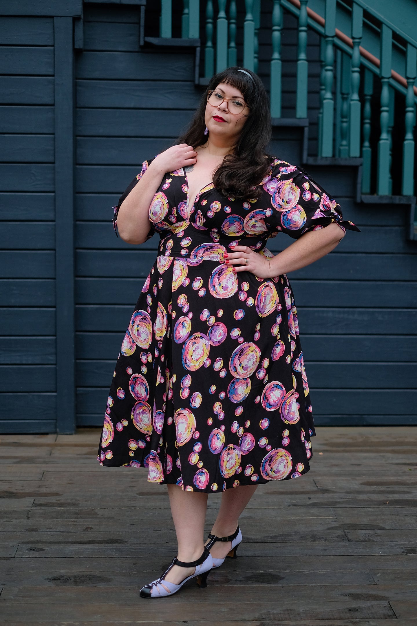 Pop the champagne, hook up the bubble machine and get ready to party! From flirty 1930s to sexy 1970s, the Bubbles Collection features styles that span the decades. We chose an original fabric design from the thirties and recreated it in rich black rayon crepe de chine and the most gorgeous palette of pastels! You can find our Bubbles fit video here.