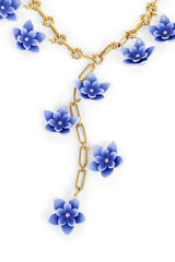An extra special piece by Yochi! Handcrafted in New York, the Blue Flower Necklace features a dangling 22k gold plated brass lariat of blue flowers cascading from the neck down.