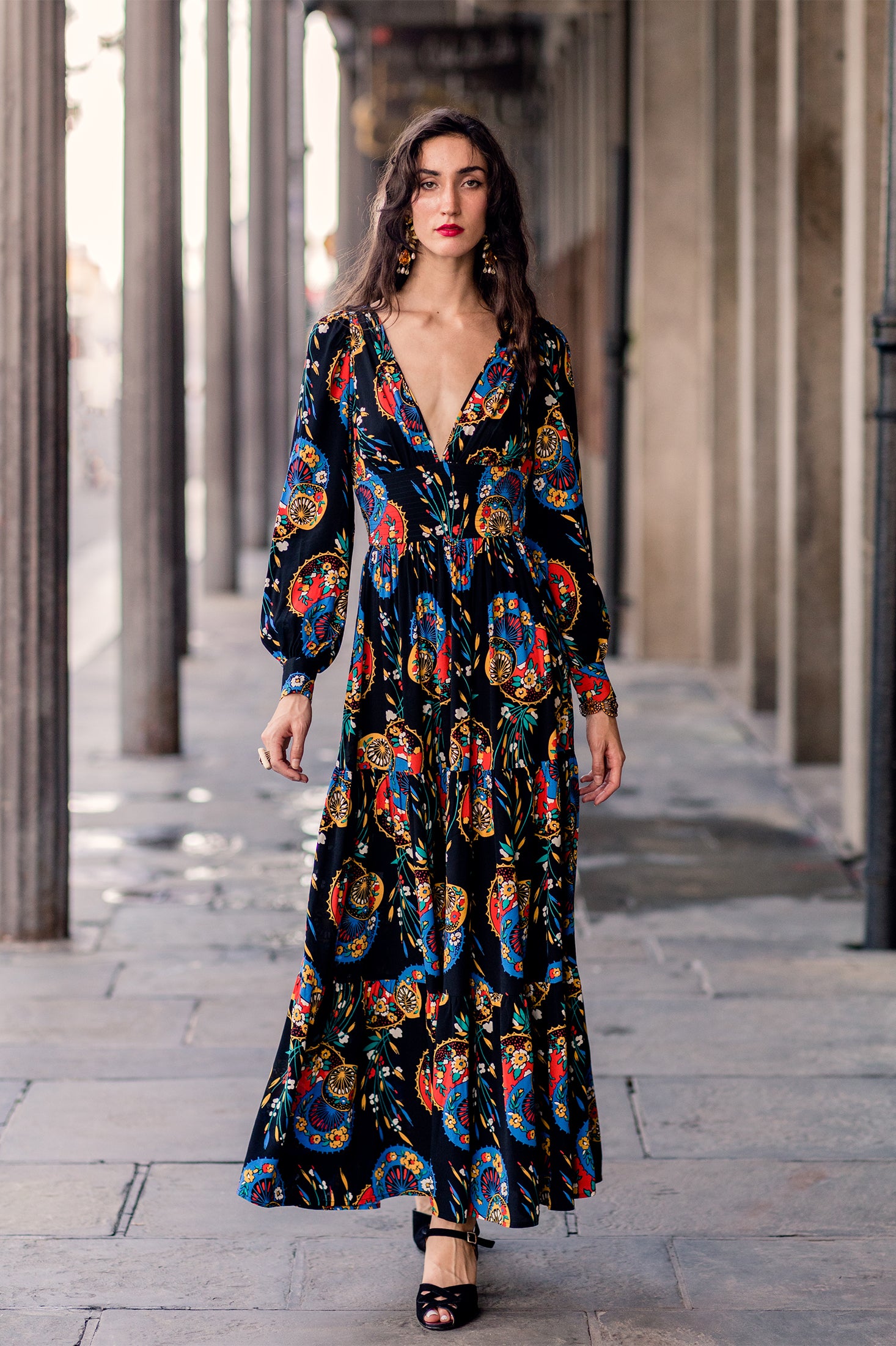 The Bianca Bow Long Dress is reinterpreted with a notched out low-cut front, and a new glam tiered (ala Bonita) long length! This figure-flattering design features our signature topstitched and fitted waist. This dress can be worn with or without the new removable bow tie front- so you can easily transition from modest work wear to sexy evening wear. The voluminous long sleeves are fitted to the wrist with a three small faux french jet buttons and vintage-style wide bands. Channel your inner Diva in this show-stopping dress!