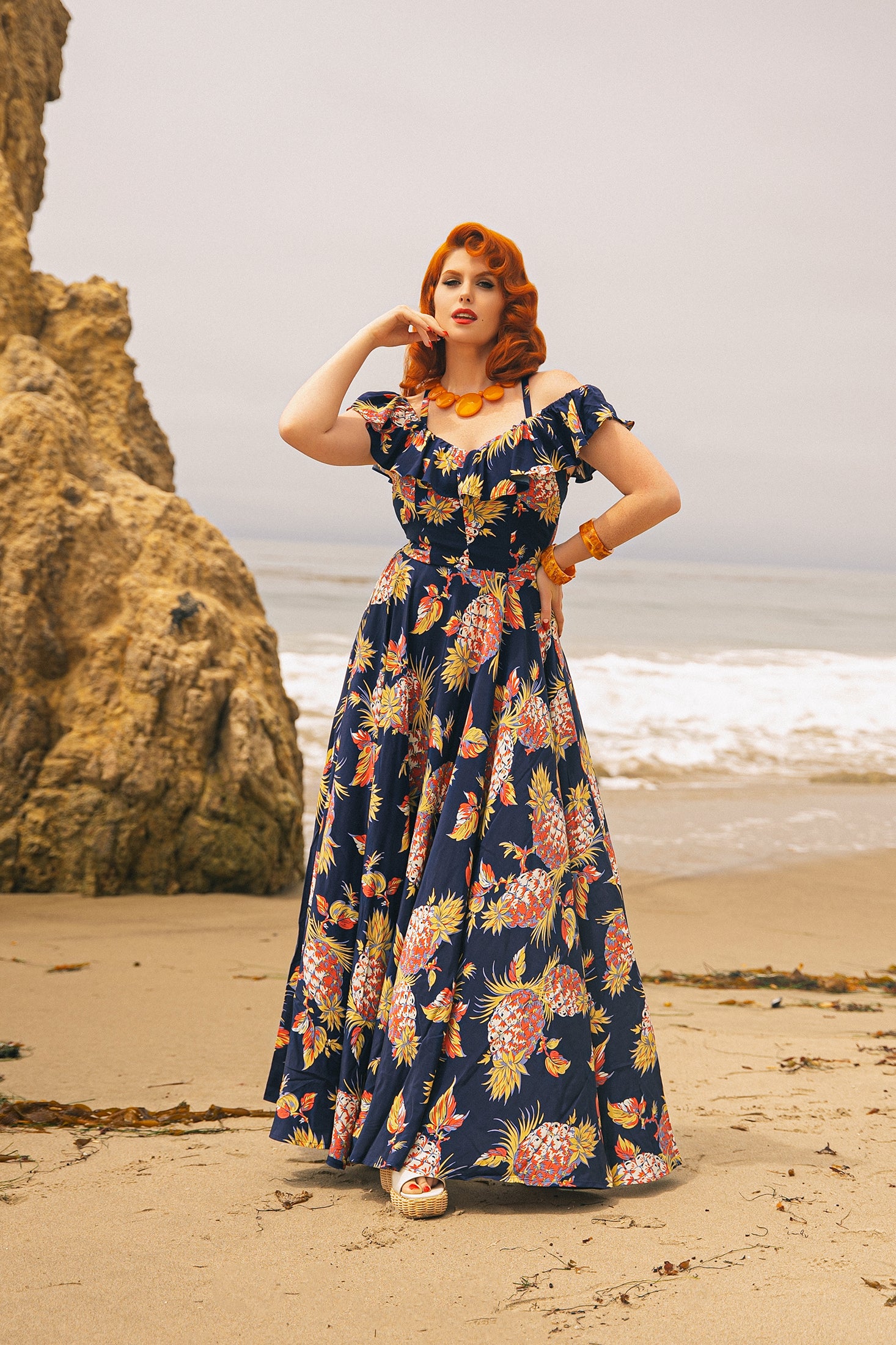 Transport yourself to the golden age of glamour with our 1940s-inspired Pineapple Collection, in cool breezy cold rayon. The timeless styles- Lena Sarong, Seaside Dress, Minda Romper, and Hollywood Long capture the effortless charm of sun-kissed starlets. Complete your getaway wardrobe with mix-and-match separates—Dottie Halter Top, Belle Pants, and Heather Blazer. Perfect for tropical escapes or the vacation of your dreams!