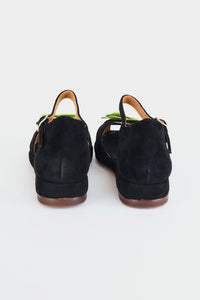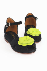 A 1940's flat sandal with floral cutout detailing. Limited edition! Custom colorway by Trashy Diva. Black Suede upper with citron leather flower bloom at the toe.