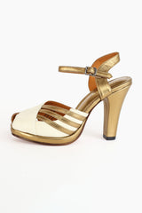 Sophisticated vamp details and cutouts add interest to this 1940’s classic peep-toe platform heel.